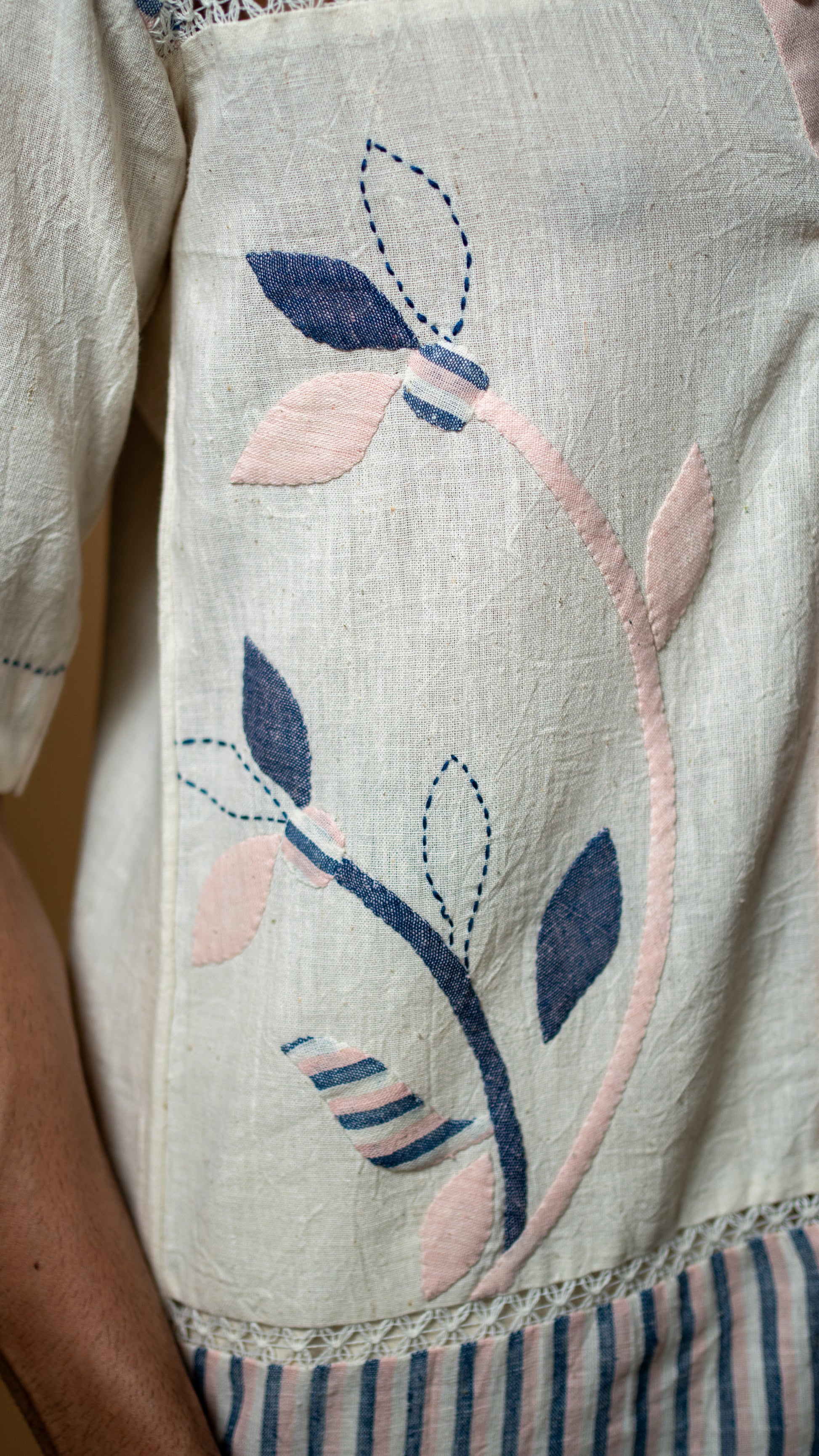 The Pastel Canopy Shirt brings together muted tones, subtle stripes, and a gentle botanical motif through a carefully composed panel design. Each element sits in balance, creating visual interest without overpowering the form. The pastel palette keeps the piece light and approachable, while the detailing reveals itself gradually.